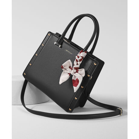 シンプルながらもバッグに施されたハートの刺繍でさりげなくフェミニンさをプラス。ハンドル部分の華やかなスカーフは、アレンジ次第で違う表情を楽しむことができます。