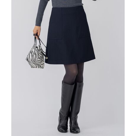 ハイウエストのAラインのスカートです。ステッチを効かせたポケットがアクセントに。膝上丈ですが裾に向かって広がる形で気になる部分はカバーしてくれます。しっかりした生地なので体のラインを拾わず、美しいAラインシルエットを保ってくれます。タイツとロングブーツで合わせる今年らしいスタイリングがおすすめです。トップスにボリュームのあるニットやカーディガンを合わせるコントラストのあるコーディネートにも適した1枚です。柔らかい印象のアイボリー(#002)、着回し力抜群のきれいめなネイビー(#075)の2色展開です。