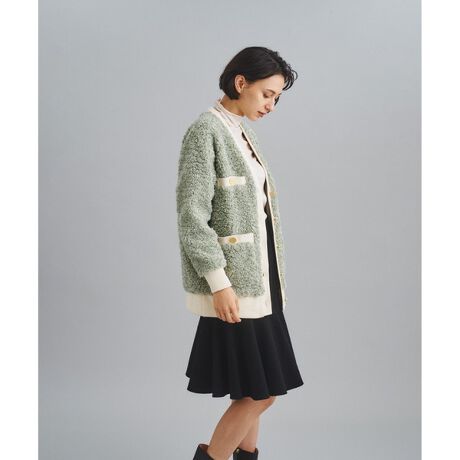 ふかふかとしたボアジャージ素材でお作りした、見た目にも着心地も暖かなカーディガン。ラメの編立ニットとのバイカラーデザインにメタルボタンを添えて、クラシックな雰囲気に仕上げた一枚です。ノーカラーのすっきりとしたデザインが、幅広い着こなしに合わせて頂けるポイント。ロング丈&程よいゆとり感のあるシルエットで、ライトアウター感覚で着こなすのもおすすめです。