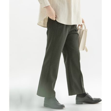 膝から裾にかけてまっすぐの美脚シルエットのセンタープレスパンツ。ふんわりと暖かみを感じながら毛玉になりにくく、ロングシーズン楽しめる素材で仕立てました。しなやかな風合いのストレッチ素材で、裏側の起毛加工を生かした裏なし仕様の暖かさを感じるボトムです。ウエストゴム仕様で内紐調整可能。両サイドポケットあり。