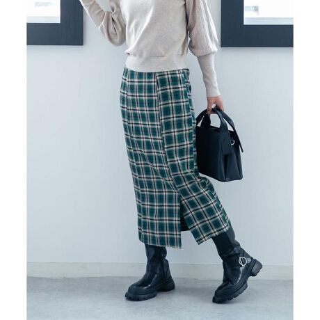 秋感漂う上品なチェック柄のタイトスカート。後ろ中心のみウエストにゴムを入れることで、きれいな見た目と着心地を両立させました。合わせるだけでシーズンムードが高まるから、秋冬のワードローブに追加しておきたい1着です。