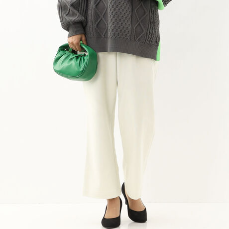 [型番:B1524RFP038]柔らかな光沢感と縦に立体的な凹凸感が特徴の生地を使ったデザインパンツ。ウエストからヒップにかけてはゆとりは持たせながらも裾に向かってやや広がったフレヤーシルエットは細すぎないヌケ感が決め手。生地の持つ縦の凹凸によりスッキリとした見え方をつくっています。ウエストベルト、ポケット周りに使ったストライプ生地もさり気ないアクセントをつくっています。