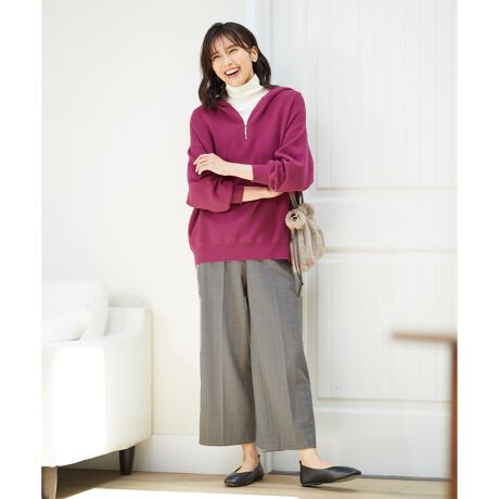 美脚&美尻を叶える楽ちんワイドパンツPOINT●リントラク加工でセンタープレス長持ち●ストレッチ、ウエストゴムで楽ちん●裏起毛で温かい■デザイン楽ちんストレッチ&ウエスト後ろゴムで快適な穿き心地が魅力の、毎日穿きたくなるワイドパンツです。センタープレスの裏側には、リントラク加工という特殊な加工を施すことにより、プレスが取れにくい仕様になっています。また、後ろのポケットは美尻シルエットを作るために、見せかけポケットにしています。キレイめコーデにもカジュアルコーデにも合わせやすい、着回し力の高いパンツです。■素材厳選されたポリエステルとレーヨンをミックスさせた糸を使用しております。その糸を高密度で織り上げ、更にマイクロピーチ起毛をかけて、ウールライクな生地に仕上げました。裏を起毛していますので、見た目以上に暖かく肌触りの良い素材です。さらにタテヨコに伸びる素材なので、穿き心地も抜群です。同じ素材のテーパードパンツ(品番:PRFXNA0400)も展開しています。お洗濯の際には、商品に付属のアテンションタグを必ずご確認ください。……………………透け感:なし裏地:なし厚さ:普通伸縮性:あり光沢感:なしポケット:(前)あり (後ろ)フェイクポケットボタン:あり……………………■スタッフ着用コメント【156cm】・・・着丈は腰で穿いてちょうど靴にかかるフルレングスくらいです。ヒールのない靴でも裾をひきずることなく履けます。ストレッチ性があり履き心地がとてもよく、センタープレスで脚長効果も期待できます。【160cm】・・・着丈は足首がちらっと見える丈です。ちょうどよい丈でした。この丈感だからこそ足元に抜け感が出せて、スッキリして見えます。後ろにポケットが付いていてヒップ周りをさりげなくカバーしてくれます。