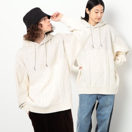 フード、身頃上部、袖の外側を裏シャギー、身頃下部をトレンドのアラン柄ニット、袖の内側を片畦ニットにしたパーカです。