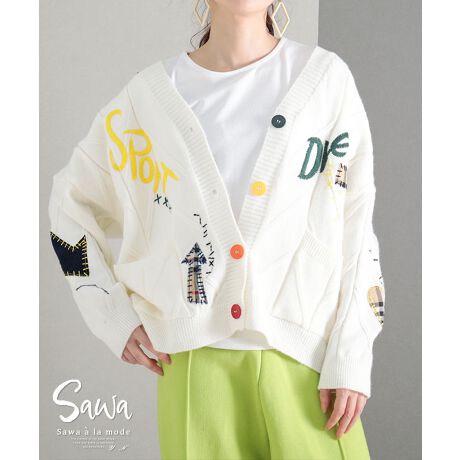 【カーディガン】レディース 長袖 ニット 刺繍 ロゴ Vネック ホワイト ざっくり アップリケ