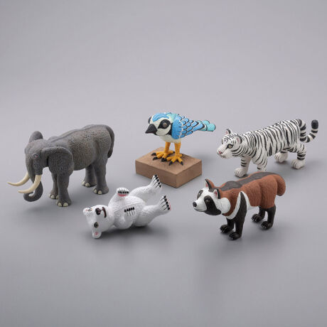 数ある作品の中から、第1弾はクマ(スピリットベア)、トリ(ブルー)、タヌキ、トラ(ホワイト)、ゾウの5作品をセレクト。