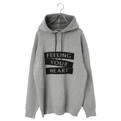 主役級の存在感を放つプルオーバータイプのニットパーカーです。フロントとバックに編地でロゴメッセージをあしらっています。インナーとアウターの中間着として、肌寒い季節の防寒対策にマストなアイテムです。