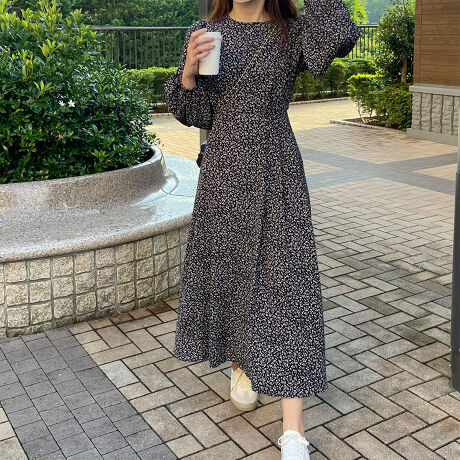 小花柄ロング長袖ワンピース