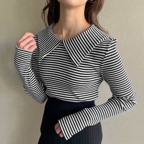 ビッグカラー長袖ボーダーリブトップス