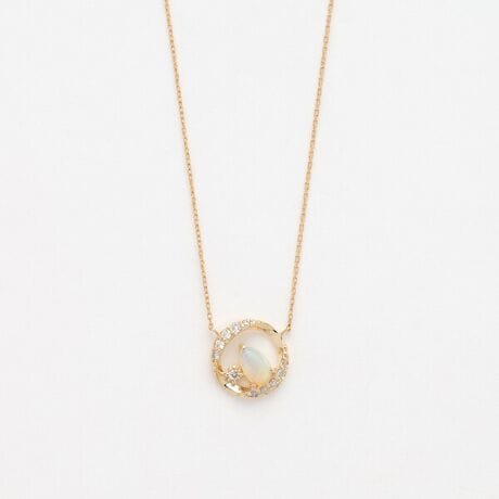 サークルの中で虹のような幻想的な光を放つオパールが、胸元の優しいアクセントに。