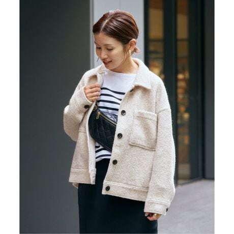 ウール混のパイルに羊の毛のような加工を施した、表情のある生地は羽織るだけで秋らしいスタイリングに。