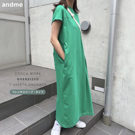 配色ステッチ オーバーサイズ フレンチスリーブ Tシャツ ワンピース