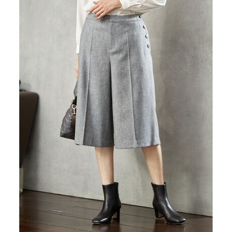 程よいワイドシルエットでスッキリ見えが叶う、キュロットパンツ。センタープレス入りのため、きれいめに着こなしやすいアイテムです。左脇に施した釦デザインがポイントになり、トップスをインするだけでもサマになります。ロングブーツとの相性も抜群。総裏ありです。