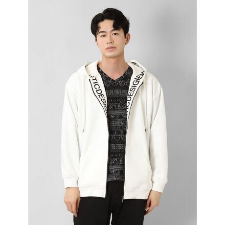 サラッと羽織れるカンガルーポケット付きのフルジップパーカーです。ロゴプリントのトリミングがアイキャッチになっています。寒暖差の激しい季節の変わり目に、ライトアウターとして大活躍してくれます。