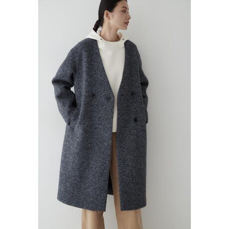 【デザインポイント】シンプルなVネックのダブル前デザインのロングコート。グレー地にネイビーの千鳥柄とネイビー地にカーキの大柄チェックの2柄展開です。