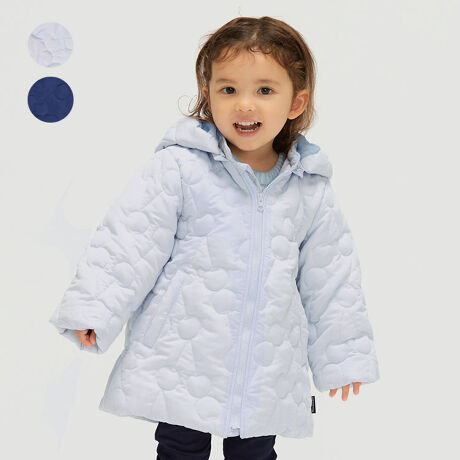 通園や通学にも使いやすい丈が少し長めの防寒アウター。ぼん天が付いたとんがりシルエットが可愛いフードはファスナーで取り外し可能です。女の子のに人気のさくらんぼ模様のキルト、キルティングもポイント!【アイテム】長袖 ロングスリーブ トップス シンプル ガーリー フェミニン カジュアル お洒落 オシャレ かわいい 可愛い 普段着 デイリーウェア お出かけ着 お外着 お外遊び着 子ども こども 女児 女の子 ガールズ キッズ ベビーサイズ トドラーサイズ 幼稚園 保育園 小学校 通園 通学 小学生 2022年秋冬物新作 丸高衣料 アウター ブルゾン ジャンパー コート ジップアップ フロントジップ ライトブルー 水色 コン ネイビー 紺色 ムージョンジョン