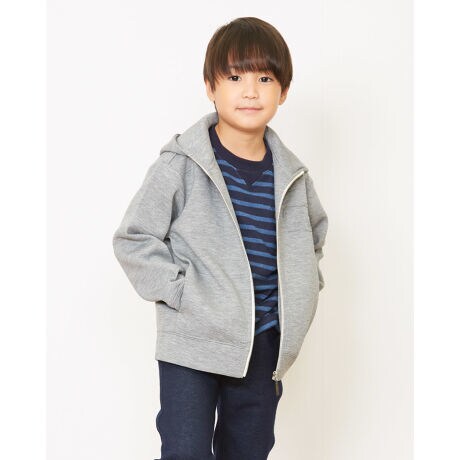 フード付きZIPアップパーカです。ダンボールニットならではの軽さと張り感を楽しめる羽織アイテムに仕上がりました。左胸のベアの柄が浮き上がってみえるエンボス加工がポイントです。襟ぐりのパイピングやファスナーの配色がスポーティな印象に。お父さんとお揃いの家族コーディネイトをお楽しみいただけます。