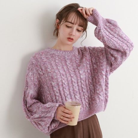 MIXされたカラーとラメが入ったケーブル編みが特徴的で可愛い1枚に仕上がっています。