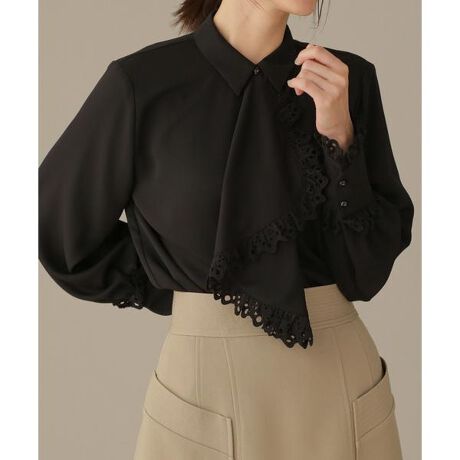 フロントのラッフルデザインが目を惹くシャツブラウス。ラッフル端と袖口カフスにコットンレースフリルを挟み込み、華やかなデザインポイントに。あえて小ぶりの衿が可愛いバランス。Vカーディガン合わせでラッフルを魅せる、クラシカルなレイヤードコーデもおススメです。