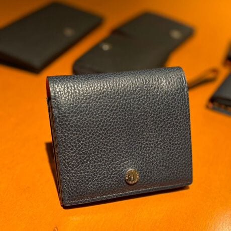 柔らかくもコシのあるシュリンク型押しはソフトで手に馴染み、深みのあるオレンジの内装が華やかな印象を与えます。また前胴にあしらわれたメダル形状のロゴプレートが顔になっています。小銭入れ部分がBOX型になっている為使いやすさに拘った二つ折り財布です。