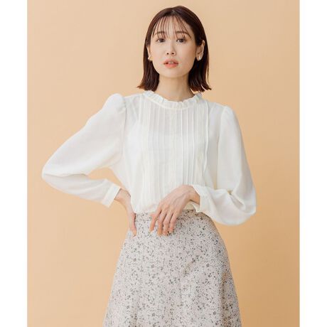 一枚着としても、レイヤードスタイルも華やかに決まる大人のフェミニンブラウス■デザイン華やかなレース使いと繊細なタックを施した大人の甘さが漂うブラウスは、コンパクトな着丈と小さな襟元が女性らしさをプラス。可愛くなりすぎないサイズ感が秀逸です。組み合わせるボトムによってキレイ目にもカジュアルにも着まわせる万能さが最大の魅力。カーディガンはもちろんプルオーバーとレイヤードして衿をのぞかせたスタイリングも素敵です。同素材のスカートとセットアップでドレス風にスタイリングしても◎。デニムなどのカジュアルなアイテムとの相性も抜群です。■素材軽やかで薄手の梳毛生地をイメージしてポリエステルで表現。柔らかくドレープ感もありながら強撚糸の特徴のシャリ感も兼ね備え、まるで天然糸が入っているように仕上げました。膨らみとしなやかさ、落ち感はありつつも、もたつき感がない上質感を持った素材です。ケアも楽で皺になりにくいのも嬉しいポイントです。■同シリーズアイテムプリーツスカート(品番:SKWXNW0401)※画像はサンプルを使用しているため、実際にお届けする商品と色味やサイズ等の仕様に変更がある場合がございます。予めご了承ください。