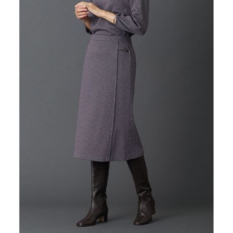 ほのかなマーメードシルエットで、大人デザインに仕上げたスカート。前をラップ風にし、飾りベルトのディテールを施してポイントに。単品使いはもちろん、同素材のカットソーとセットアップで着るのもおすすめ。柄はオリジナルの幾何柄です。