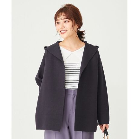 ■デザインフード付きのニットコーディガンです。リバーコート風の上品なデザインの為、カジュアルからフェミニンなコーディネートまで幅広く合わせやすいアイテムです。両脇についているポケットはスマートフォンも入る便利な大きさなのも嬉しいポイント。肌寒くなる季節にぴったりな気軽に羽織れるニットアウタ―です。