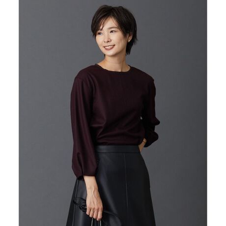 配色デザインが目を引くきれいめカットソー。単品使いはもちろん、同素材のスカートやパンツとセットアップで着るのもおすすめです。カットソーでありながら上品な光沢感があり、イージーケア素材なので通勤にもお使いいただけます。