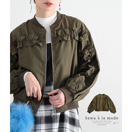 サラッと羽織るだけでお洒落なフリルが流れるMA-1。胸元からお袖に流れるフリルが可愛らしい雰囲気にしてくれます。ふわっと膨らみのあるボリュームスリーブが大人可愛いです。オーバーサイズなシルエットで程よい抜け感を演出してくれます。どんなコーディネートとも合わせやすく長い季節着用できます。