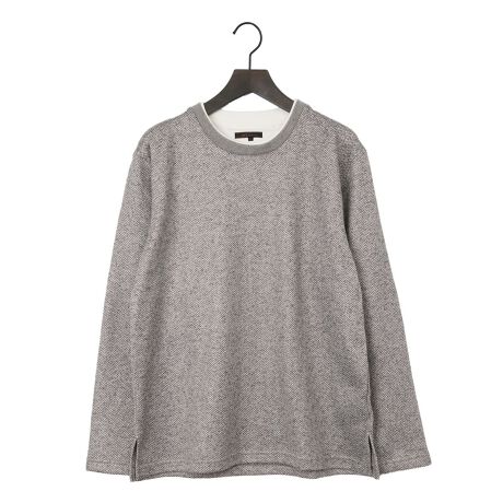 トップスを二枚重ね着したように見える、クルーネックの長袖プルオーバーです。別生地で切り替えたフェイクレイヤード仕様で、重ね着風のお洒落コーディネートが一枚で簡単に完成します。一枚で着るのはもちろん、ジャケットやシャツ、ベストのインナーアイテムとしても便利なアイテムです。