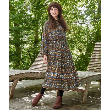 コーデの主役に活躍するワンピース。ウエストマークできるリボン付き。フォークロアテイストな柄で華やかな秋冬コーデに。