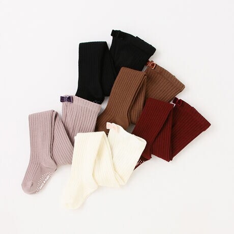 ウール混であたたかいソフトな風合いのリブタイツです。寒い日の防寒をしながらおしゃれが楽しめるレイヤードにぴったりのアイテム。ウエストリボンつきで、見えないところまでキュートに仕上げています。80、90サイズのみ足裏にすべり止めプリントつきです。