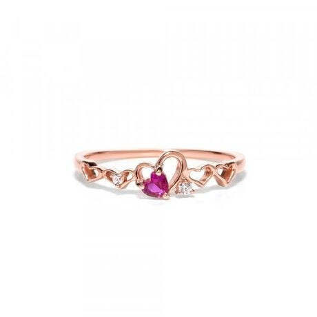 ハートモチーフを連ねた可愛らしいデザインに、鮮やかなルビーカラーのストーンがきらりと映えるリング。
