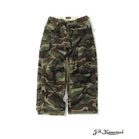 ウエストはGI-バックルで調整可能。カモフラージュとバックサテンを切り替えてパッチ、当て布を入れたミシン補修、裾を断ち切り更に当て布を入れてHARDなダメージを演出しています。