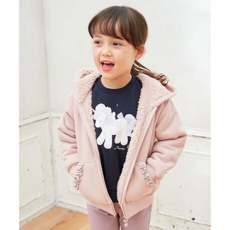 パーカーデザインのキュートなブルゾン。フードの部分はトメッCIAOになっているので、学校にも着用頂けます。ファスナーのチャームがハートのキラキラで、さらにポケットにはサテン生地のフリルが付いた女の子らしいデザインになっています。デイリーに活躍すること間違いなしの、あったかブルゾンです。