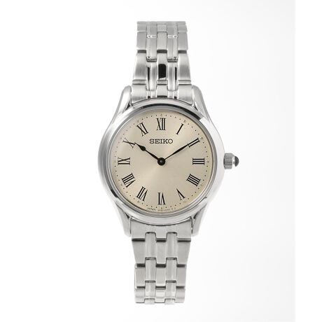 一般的な時計店では取り扱いがなく、主に海外で展開されているモデルです。ビジネスシーンで活用が期待できるクリーンなシルバーケースとブレスレット。少しだけシャンパンがかった文字盤カラーと、ローマ数字の組み合わせはクラシックなニュアンスをプラス。