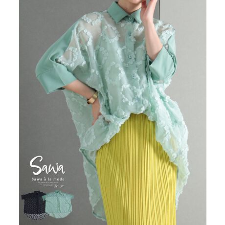 ポコポコとダイヤ柄に施された刺繍がオシャレでトレンディーなシアーシャツ。バックシルエットの上部分、袖部分は透け感の無い素材になっております。今年は何といっても透け感がオシャレのポイント☆インナーに困られないよう同色のインナーもセットになっているので届いたらすぐに着れるようになっております。