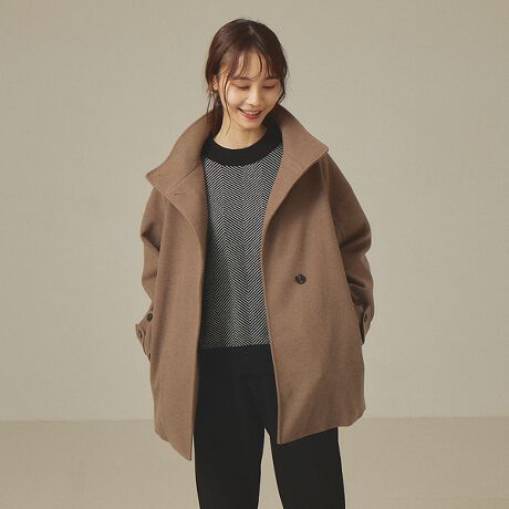 [型番:72459900624]定番のジャージーメルトンのスタンドカラーコート。後ろの立体的なフォルムがポイント。お尻が隠れて、裏地も付いているので寒い時期にも大活躍します。ボタンを閉めて着ればさらに首元あったか◎