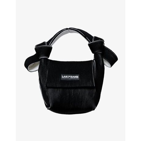 LASTFRAME/ラストフレーム/ICHIMATSU OBI BAGSize: 幅25cm x 高さ18cm x マチ9cm x ハンドル32cm しっかりとした肉感を持たせる為に、伸縮性のあるポリエステル糸を本製品用に別注で撚糸をした素材を使用。日本国内に数台しかない特殊な編み機を使用し、通常の編み機では再現出来ない細かな柄表現が可能なその特性を活かし、表裏を配色にしたリブ編みの様な編み地を表現。ニットの動きによって見える配色で、立体感のある異なる表情を見せる。張り感ある素材でありながらも軽く、縦には伸びにくいが横への伸縮性は十分にあり、見た目以上の収納力で使いやすさが特徴のニットバッグ。結んだ帯の様な持ち手が特徴的。LASTFRAME/ラストフレーム 『世界最高レベルの日本の伝統技術を未来に継承する』デザイナー奥出 貴ノ洋が経験してきた世界中の様々なカルチャーをベースに、メイドインジャパンに拘り表現した日本発のブランドLASTFRAME(ラストフレーム)。中でも職人の数が年々減少している伝統技術にフォーカスを当て、デザイナーのフィルターを通した現代的解釈により、これまでに無い独自のデザインで表現している。日本の伝統技術を継承しながらも、国・時代・シーズン・性別など何ものにもとらわれることなく、ボーダーレスに愛され続け、そして受け継がれるデザインを目指し、メイドインジャパンのラグジュアリーブランドとして世界に発信する。LASTは「最後」と「存続する」という異なる意味をもつ。 消えゆく日本の職人技術・伝統技術を「フレーム」に収め、デザイン・プロダクトとして昇華させ、存続させていく。LASTFRAMEとはブランド名であり、「世界最高レベルの日本の伝統技術を未来に継承する」その活動自体を意味する。