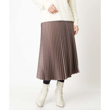 軽さのあるレザーライクなプリーツスカート。やわらかな風合いは強すぎず女性らしく着こなせます。ウエスト部分はゴム仕様なのでストレスフリーな着心地に。