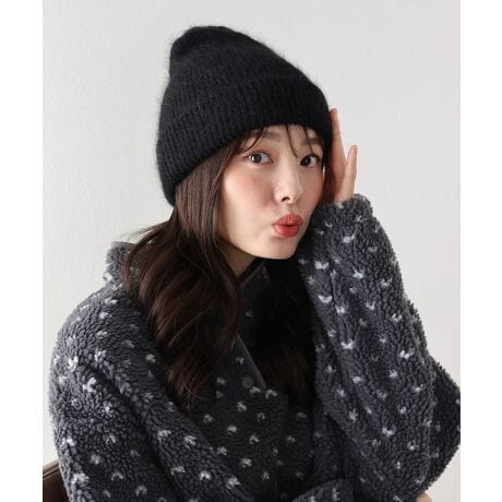 毛足が長めのふわふわとしたアンゴラ毛でシーズンムードたっぷりに仕上げたニットキャップ。