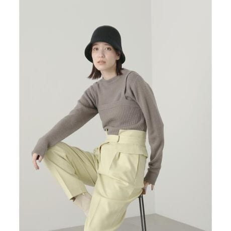 編地をさりげなくかえてレイヤード風に見せるニット。キャミソール型のニットをクルーネックニットに重ね着しているように見せるデザイン。レイヤード風デザインのため、着崩れなどの心配なく着用できます。デザインをいかすように、スカートやパンツにINするとバランスの良い着こなしに。