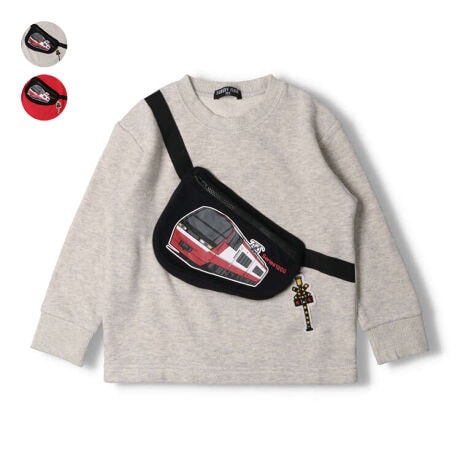 男の子が大好きな電車アイテム!名鉄電車、名古屋鉄道商品化許諾済み商品です。人気のボディバックデザインのトレーナー、スウェット。トレーナーにボディバックがくっついています。ファスナーを開けるとちょっとした小物を入れられます!ボディバックにはパノラマsuperのプリント入り。ファスナートップ風の踏切のアップリケもポイントになっているので、踏切好きにもオススメなアイテム。裏毛素材で秋から春まで長く着られます!(ベビーサイズのみ肩ボタン仕様になります。)【アイテム】ロングスリーブ 長袖 トップス カジュアル お洒落 オシャレ かっこいい かわいい 可愛い 普段着 デイリーウェア お出かけ着 お外遊び着 子ども こども 男児 男の子 ボーイズ キッズ ベビーサイズ トドラーサイズ 幼稚園 保育園 小学校 通園 通学 小学生 2022年秋冬物新作 丸高衣料 鉄道 子鉄 車両 電車 電鉄 トレイン グレー 灰色 レッド 赤色 ハングリーハート コットン100% 綿100%