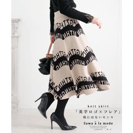 センス溢れる英字ロゴのニットフレアスカート。ベージュ×ブラックの配色がお洒落なデザインのスカートです。英字のロゴが他にないモードな雰囲気にしてくれます。ウエストは総ゴムなので長時間の着用も楽に穿いて頂けます。綺麗なAラインのフレアシルエットで高見えする1枚です。