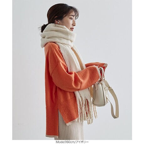 シーズンライクなふわふわマフラー。起毛感があり、ふわふわの質感がトリコになるデイリー使いにオススメ。ボリューミーなサイズ感とロング丈で、ショールのように羽織っても、ぐるぐる巻きでも可愛さ◎防寒アイテムとしても重宝すること間違いなし。【素材・サイズ感】起毛感があり、肌あたり柔らかいタッチの素材感。顔や首元に直接あたるので、肌触りの良い素材で仕上げています。大きめのサイズ感で巻き方もアレンジしやすく、ON/OFF問わず、コーディネートに取り入れやすいのも嬉しいポイント。
