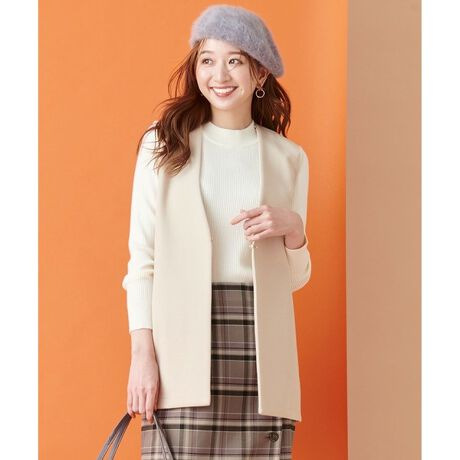 ■デザインコーディネートに取り入れやすいシンプルなデザインのジレです。お手持ちのニットやブラウス、ワンピースと合わせてお好みのスタイリングをお楽しみください。程よい長さの着丈でパンツ合わせはもちろん、スカートにも合わせやすくなっています。サイドには便利なスリットポケット付き。ゴールドのメタルバーのホックで付きで前を閉めたスタイルもすっきりとサマ見えします。