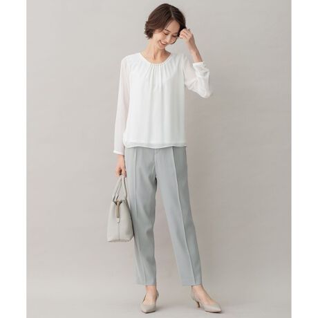 自由区ならではのスーツシリーズ■デザインセンタープレス入りのテーパードパンツ。すっきりとしたシルエットでキレイ見えしながら、楽な着心地が魅力です。シンプルなデザインで汎用性の高いアイテムです。■素材ストレッチ性に富んだストレスフリー素材。ドレープの美しさとふっくらとした膨らみ感が魅力です。糸自体が発色性を抑える作りで光の乱反射をしないため、しっかりとした色目が独特の見え感を演出します。■同素材アイテムテーラードジャケット(JKWMNZ0421)ノーカラージャケット(JKWMNZ0422)セミフレアスカート(SKWMNZ0421)