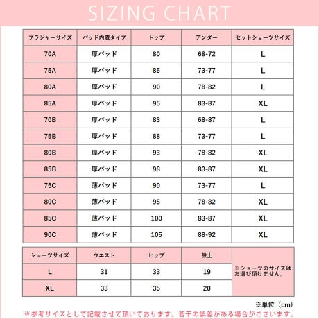 C90(薄パッド内蔵)→アンダー:88-92cm トップ:105cm ショーツXL