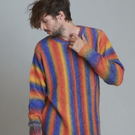 切り替えなどとは異なり、ミックス糸を用いて編み立てることでカラーが変化するニットの為、仕上がり時の柄の雰囲気は一点ずつわずかに個体差が生まれるのも特徴のひとつ。