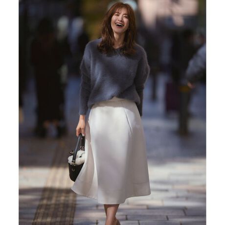 ■デザイン裾の広がりが美しいフレアスカートは、動くたびにゆれる裾の感じが素敵です。タテのラインを強調するハの字に切った切り替えがポイントで、ウェストをすっきりとみせ、ハイウェストで着用いただくことで脚長効果が生まれます。また脇線をなくすことで自然なフレア感をだしており、腰まわりからウェストにかけて素材とデザイン線ですっきりとすいつくようにみせています。後ろがゴム仕様になっており、イージーな着心地はありながら、後ろのゴムは着用すると、なくなる程度の分量感にすることでゴムの入ったカジュアルなスカートに見せないようにしました。